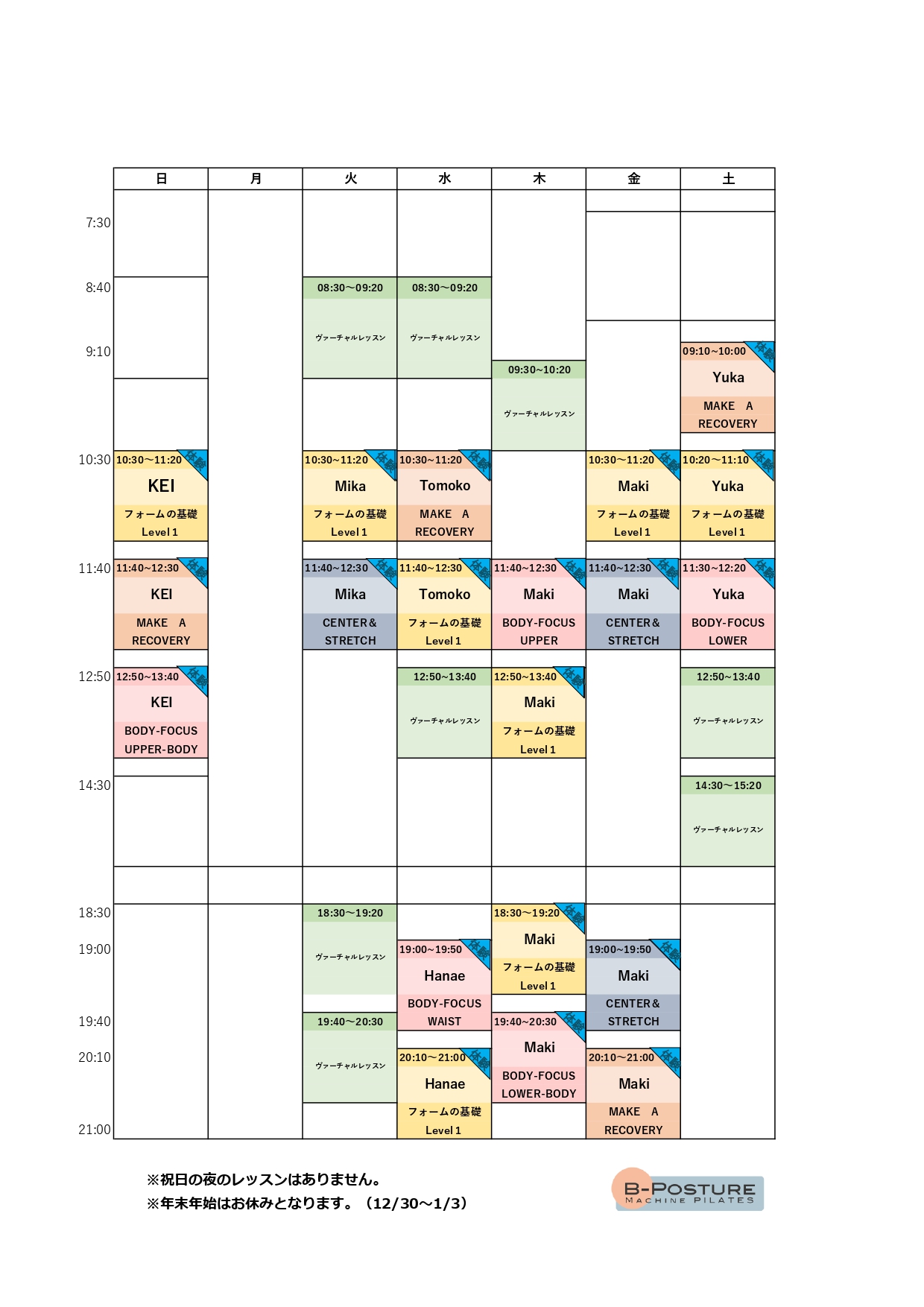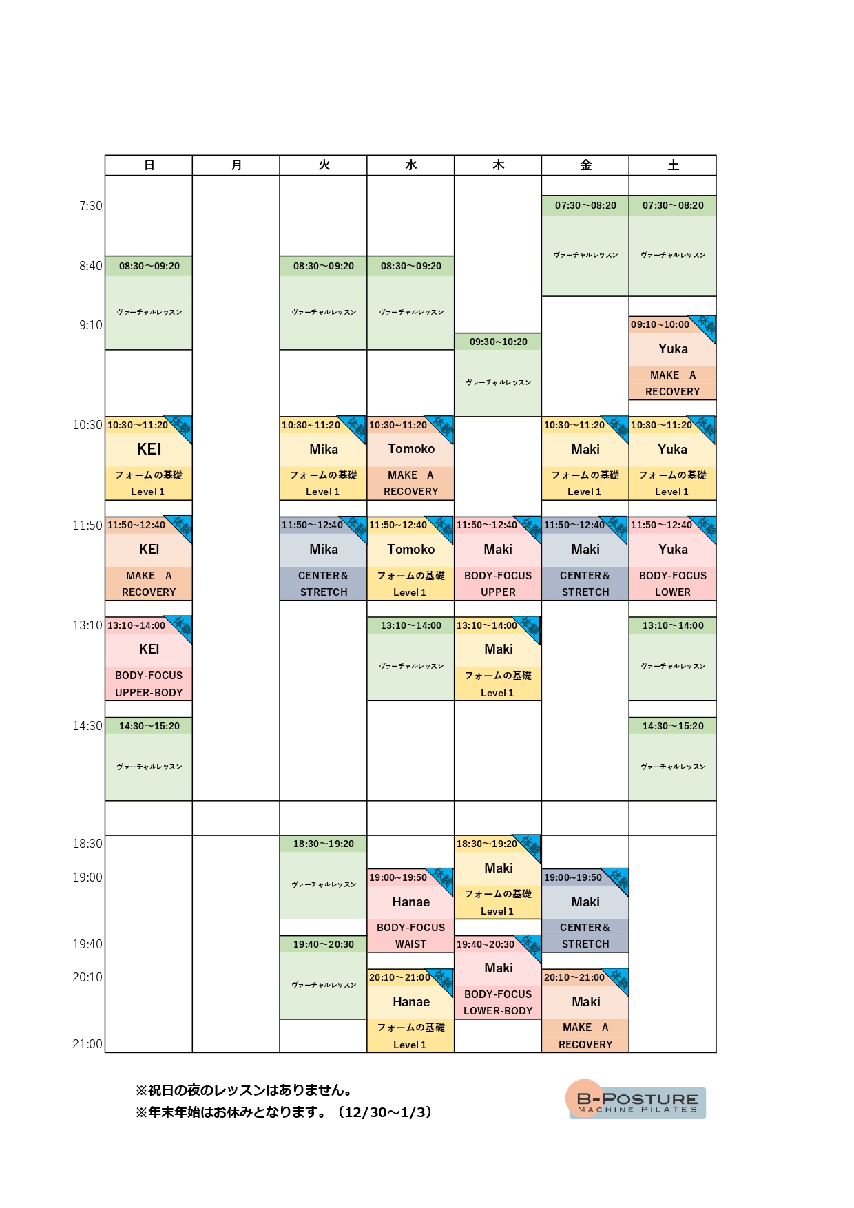 妊娠中の方はご利用できかねますのでご注意ください。 - Q 祝日のレッスンを教えてください。