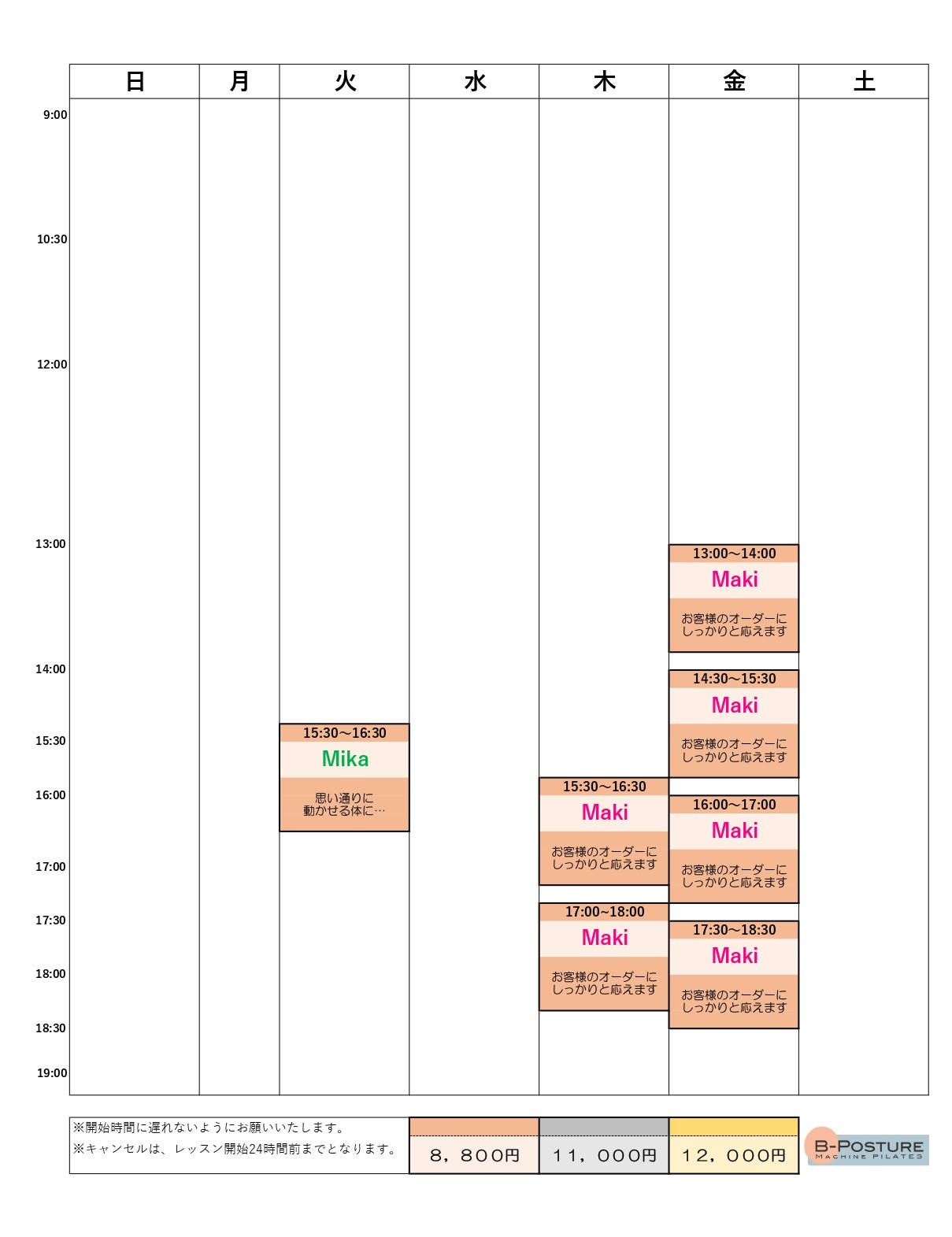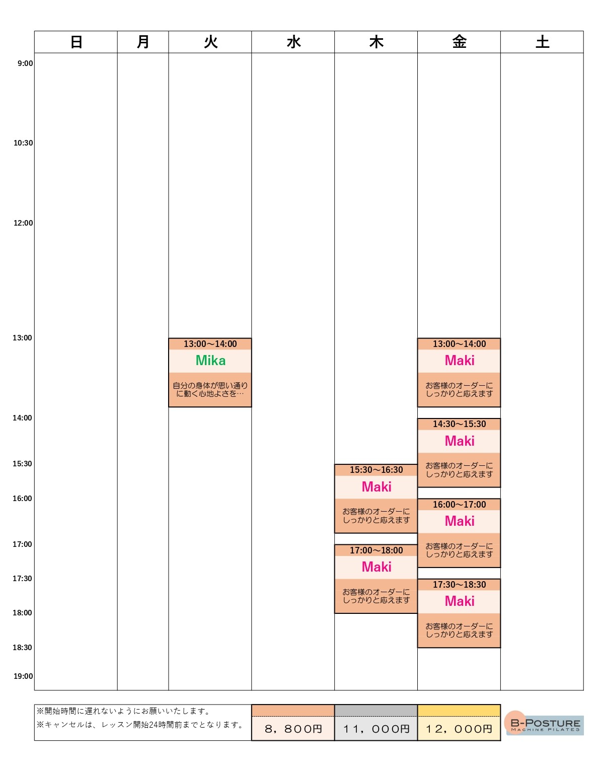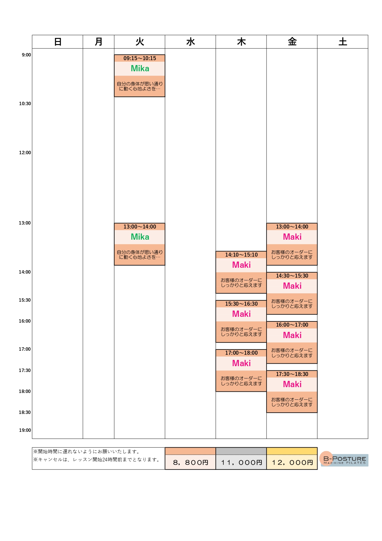 ホームページのパーソナルトレーナーとパーソナルスケジュール表をご確認ください。
