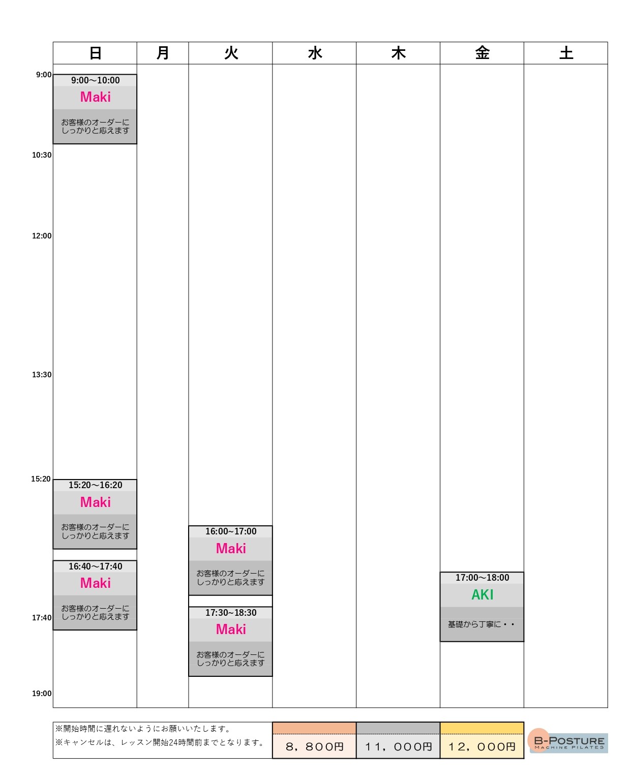 ホームページのパーソナルトレーナーとパーソナルスケジュール表をご確認ください。